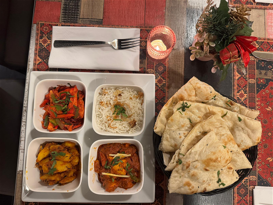 Alle gerechten worden geserveerd met Naan brood of rijst